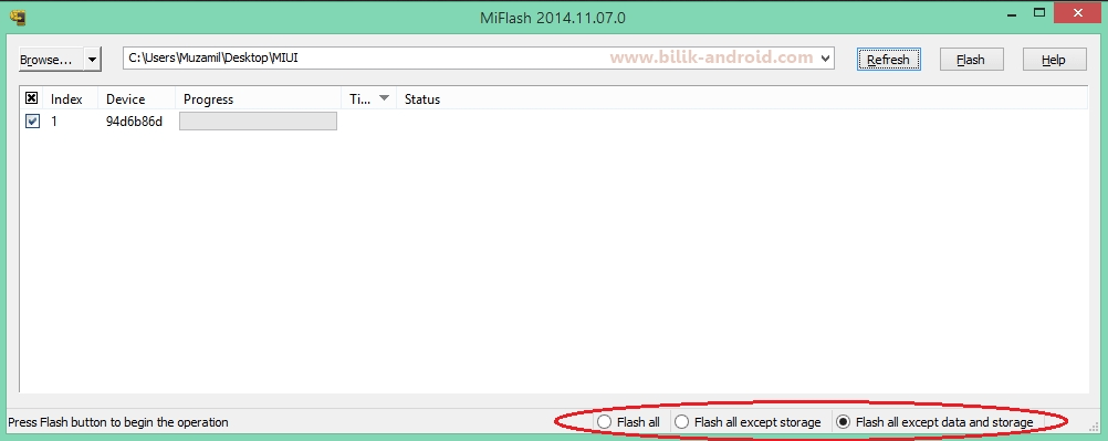 Lankah-langkah Flash xiomi 1). Install MiUI Flashing Tool seperti biasa. 2). Extract file MiUI Room tadi pada PC atau Laptop. 3). Buka Mi Flasah yang sudah di install tadi. Jika Mi Flash tidak ditemukan di desktop, anda bisa cari di C:\Program Files (x86)\Xiomi\Miphone\ untuk windows 7 4). Matikan smartphone Xiomi setelah itu masuk ke dalam mode Flastboot dengan cara menekan tombol Power dan Volume Down secara berbarengan. 5). Sambungkan perangkat anda ke Laptop atau PC. 6). Tekan “Refresh” pada Mi Flash supaya lebih meyakinkan bahwa perangkat sobat benar-benar sudah terdeteksi. 7). Klik “browse” dan pilih Fastboot Room yang sudah di ekstrak tadi. 8). Setelah yakin perangkat terdeteksi, silahkan pilih opsi yang ada dibawah. Opsi tersebut antara lain Flash ALL, Flash ALL Except Storage, dan Flash ALL Except Data and Storage. Silahkan pilih sesuai keinginan anda.